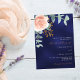 Um fundo azul marinho colorido. A cor azul é irregular. Decorados com ouro-rosa e folhas de eucalipto cor-de-rosa-esbranquiçada, flores de rosa e cor-de-rosa-esbranquiçada, galhos, verde-verde e um cinzeiro de ouro falso. Personalize e adicione seus nomes e detalhes. Texto branco e ouro. Fundo: fundo azul marinho incolor.
