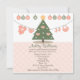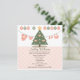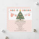 Uma árvore de Natal decorada com enfeites de coração rosa com uma estrela no topo e uma linha de roupa de bebê atrás dela adornam esses convites de chá de bebê de Natal bonitos e preciosos para uma menina. Enfeites pendurados em alto grafam "É uma menina!". Um par de bloomers rosa adorável e sapatinhos de bebê e um babador pendem atrás da árvore. Clique no link a seguir para ver todas as nossas obras originais da Chrissy H. Arte e ilustração © Chrissy H. Studios, LLC. Todos os direitos reservados.