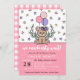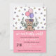Menina, podemos esperar chá de fraldas convite com uma ilustração desenhada à mão de um ursinho de pelúcia com balões, um arco e verde rodeados por estrelas pequenas. Chá de fraldas de bebê roxo e rosa com tema de ursinho de pelúcia. Chá de bebê urso de pelúcia, a rosa, com estrelas e balões e um urso. Rosa podemos esperar muito pelo convite do chá de fraldas.