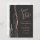 A borda esquerda deste elegante casamento moderno salve o cartão de data apresenta uma borda de agata preta, aparada com uma falsa rosa dourada. O texto personalizável combina a escrita manual rosa-rosa, a placa de impressão e as fontes itálicas em um plano de fundo não preto. Substitua facilmente a imagem de exemplo no verso por sua própria foto vertical e adicione seu URL do site de casamento ou outra mensagem breve na fonte de impressão rosa rosa.