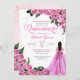 Convite de quinceanera em rosas florais cor-de-rosa com sotaques de ouro e uma garota com vestido elegante. Verifique o compro deste convite com meninas com diferentes cores de cabelo e tons de pele.