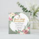 Cor-de-rosa elegante e rosa-rosa e branca floral com o design de texto de guião verde sábio "Primeira Comunhão" com linhas geométricas em tons de ouro.