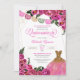 Convite de quinceanera em rosa cor-de-rosa quente com sotaque de ouro e papel picado banner e vestido de relva. Verifique o compro deste convite com meninas com diferentes cores de cabelo e tons de pele.