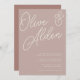 Um belo convite de casamento baseado em tipografia, com os seus nomes em letras de escrita sobredimensionadas no topo, em tons de tons para um efeito de marca d'água. Personalize com seus detalhes de casamento em letras clássicas de serif alinhadas no canto inferior direito. Nossa Rosa Taupe colorida é uma elegante mistura de pinks neutros, com letras brancas quentes e clássicas em um fundo rosado.