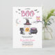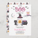 Celebrar o Halloween usando o nosso convite de Chá de fraldas Rosa A Pequeno! Esta design encantadora apresenta um fantasma giro vestindo um chapéu de bruxa e segurando uma abóbora, um gato brincalhão, uma coruja rosa adorável, e um caldeirão rosado. Os morcegos fluem pelo céu, com uma lua brilhante e estrelas cintilantes se somando à atmosfera mágica. BBS454