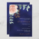 Um fundo azul marinho colorido. A cor azul é irregular. Decorados com ouro-rosa e folhas de eucalipto cor-de-rosa-esbranquiçada, flores de rosa e cor-de-rosa-esbranquiçada, galhos, verde-verde e um cinzeiro de ouro falso. Personalize e adicione seus nomes e detalhes. Texto branco e ouro. Fundo: fundo azul marinho incolor.