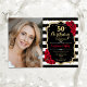 Elegante convite floral feminino para o 50º aniversário com sua foto. Design branco preto-claro com ouro brilhante. Apresenta faixas pretas e brancas, rosas vermelhas, fontes de script e confetti. Perfeito para uma festa de comemoração de na moda adulto. Personalize com seus próprios detalhes. Pode ser personalizado para qualquer idade! Impressos convites Zazzle ou modelo de impressão digital instantânea para download.