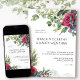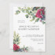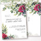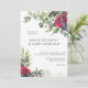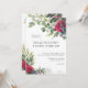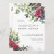 Convite de casamento de rosa vermelha com rosas vermelhas de aquarela, folhas de eucalipto e simples layout de tipografia moderna. O modelo está pronto para que você adicione seus detalhes de convite da frente, assim como as iniciais da noiva e do monograma do noivo no verso. A floral botânica convida com tema romântico do jardim floral e elegância contemporânea.