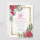 Belos rosas vermelhos e brancos estão aninhados em folhas de preto e eucalipto para criar um elegante display floral. Eles decoram uma grande estrutura de ouro e são aplicados com poeira de confete de ouro. A festa surpresa de aniversário de 18 anos e o nome da pessoa estão escritos em um grande texto vermelho. Todo o texto pode ser editado. Escolha perfeita para uma celebração especial de aniversário no inverno.
