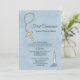 Um primeiro convite da Santa Comunhão apresenta miçangas rosárias tonadas a ouro e velas brancas com uvas em um fundo azul de cor d'água.