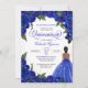 Convite de Quinceanera em rosa azul real com sotaques de ouro e uma garota com vestido elegante. Verifique o compro deste convite com meninas com diferentes cores de cabelo e tons de pele.