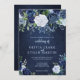 Um convite elegante com detalhes de seu casamento em letras brancas cercado por rosas deliciosos em tons de azul e branco em um fundo de marinho escuro clássico. Você pode adicionar sua própria mensagem especial indo para o menu personalizar. Este convite é parte de uma bela suíte de casamento que pode ser totalmente personalizada.