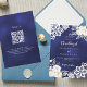 Para um casamento elegante e romântico. Um fundo azul marinho, incolor, decorado com flores, rosas e rendas brancas. Personalize e adicione seus nomes e detalhes. Voltar: adicione o URL do seu site ao código QR para RSVP e/ou mais detalhes.