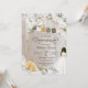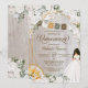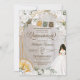 Quinceañera convite em rosas brancas elegantes, peonias, e hydrangea com sotaques de ouro e papel picado bunting banner, chapéu charro e vestido. Verifique o compro para este convite com garotas com diferentes cores de cabelo, tons de pele e mais variações.