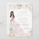 Elegante design de luxo com rosas brancas e rosas cor-de-rosa com pincel suave, sotaques de rosa, e uma bela boneca com um luxuoso vestido de bola voada. Todo texto é totalmente personalizável.
