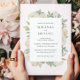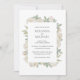 Elegante convite de casamento botânico com um quadro de rosas de marfim e branco pristina e folhas gentis sobre o fundo branco clássico e seus nomes e todos os detalhes especiais de casamento escritos em uma fonte de cinza clássica. O reverso da placa tem um buquê pequeno na parte inferior. Quer você esteja planejando uma comemoração chica de verão ou um caso romântico de primavera, este convite dá o tom perfeito para seu dia especial.