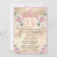 Este convite de festas personalizado apresenta um glamouroso tema de 15 anos da quinceñera em um fundo de ouro, em estilo metálico. Uma coroa cor-de-rosa tiara ou quinceañera é colocada acima do número 15 para representar o ano de 15. Um quadro brilhante cor-de-rosa correspondente borda o convite. Buquês elegantes de rosas cor-de-rosa e brancas soam as bordas.