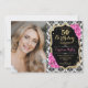 Elegante convite floral feminino para o 50º aniversário com sua foto. Design cor-de-rosa preto brilhante com ouro brilhante. Apresenta cor damasco preta e branca, rosas cor-de-rosa, fonte de script e confetti. Perfeito para uma festa de comemoração de na moda adulto. Personalize com seus próprios detalhes. Pode ser personalizado para qualquer idade! Impressos convites Zazzle ou modelo de impressão digital instantânea para download.