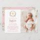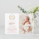 Este belo convite batismo apresenta uma coroa de adoráveis rosas cor-de-água rosa com folhas verdes e sotaques de rosa dourados falsos, com uma cruz falsa de ouro no centro. A foto do seu bebê aparece no cartão, juntamente com um roteiro manuscrito em rosa dourado falso. A parte traseira da placa é cor-de-rosa suave com buquês florais correspondentes nos cantos.
