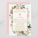 O Convite para Batismo Floral Branco Cor de Água Elegante moderna, cor rosa-branca, inclui rosas cor-de-rosa, flores brancas, folhas de eucalipto e outras lindas folhagens botânicas verdes. Dourada Cruz.