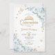Azul bebê, ouro e Quinceanera branca convite para comemoração. Apresenta fontes de script, borboletas douradas, rosas azuis de pó pastel e tiara. Perfeito para uma elegante celebração de glam estilo princesa. Personalize com seus próprios detalhes. Impressos convites Zazzle ou modelo de impressão digital instantânea para download.