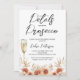 Petais de Rosas de Laranja Queimados Chá de panela Prosecco Petais Modernos e chá de panela temático Prosecco com um vidro alto de champanhe e um adorável rosa de laranja queimado e pomares brancos arranjos florais. Este design também apresenta uma fonte de caligrafia moderna editável.