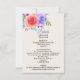 Cartão de cerimônia com detalhes de casamento com um buquê floral fantástico com rosas de aquarelas. Na moda, capricho e criativo. Um conjunto de rosas em rosa, roxo e amarelo. Com muitos galhos e folhas em verde, rosa, roxo e azul. O fundo é uma cor de champanhe esbranquiçada.
