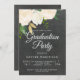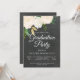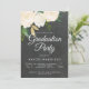 Uma festa de formatura cinzenta com um fundo de chalkboard em camadas com um arranjo floral de aquarela de canto com rosas de marfim e folhas verdes, com um toque de cintilação falsa. Os detalhes da festa estão em fontes de sans e script brancas. Um fundo do quadro de controle também se apresenta no backer.