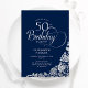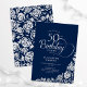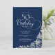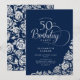 Simples elegante 50º convite de aniversário em marinho e prata. Design clássico com rosas, folha prateada falsa e letra de script de tipografia. A Trendy convida o cartão perfeito para uma festa de na moda. Personalize com seus próprios detalhes. Pode ser personalizado para qualquer idade. Impressos convites Zazzle ou modelo de impressão digital instantânea para download.