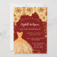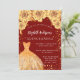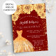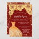 Um convite moderno, na moda e glamouroso para uma Quinceañera, festa de aniversário 15. Um fundo vermelho com poeira falsa dourada, um vestido e ouros, flores. O nome é escrito com um moderno estilo escrito à mão. Personalize e adicione os detalhes da sua festa.