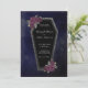 Escuro e lindo, este convite de casamento de caixão é perfeito para um casamento gótico ou de Halloween. O caixão tem brilho de glitter cinza em torno das bordas e rosas roxas com folhas verdes douradas e cinzas. Veja nossos itens góticos coordenados.