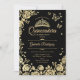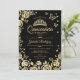 Convite para comemoração da Quinceanera de ouro negro. Apresenta fontes de script, borboletas, rosas de ouro e tiara. Design elegante com foto na parte traseira da placa. Perfeito para a celebração do estilo da princesa. Personalize com seus próprios detalhes. Impressos convites Zazzle ou modelo de impressão digital instantânea para download.