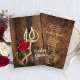 Convide os convidados para uma festa pré-casamento casual, mas clássica, ao estilo rancho, honrando a noiva e o noivo para estarem com o encantador Convite para Chás de casamento Ocidentais para Rosas vermelhas e Bits de Cavalo. Este rusticado Chá de panela temático equino personalizado Invite apresenta uma fotografia floral ligeiramente melhorada digitalmente de flores de rosa vermelha, colar de pérolas, rédeas de cavalo e de couro com madeira de celeiro marrom rústica.