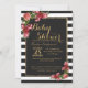 Rosas elegantes, quentes e vermelhas e rosa-do-campo com listras negras e brancas e vermelho-preto esmaltado em ouro esboçado, convites para Baby Shower. Este design clássico e sofisticado é perfeito para a mãe da classe, da moda e da na moda. Personalize com sua própria mensagem na frente e um monograma personalizado inicial no verso. Todas as impressão de fotos.