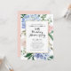 Convide familiares e amigos para o seu evento com este convite de aniversário de casamento floral. Apresenta ilustrações em aquarela de hífenes azuis, rosas cor-de-rosa pinceladas, eucalipto e verde com estrutura falsa em folha de ouro. Personalize adicionando detalhes de evento, nome, hora, data, local e outros eventos. Você também pode mudar a imagem traseira para uma foto ou qualquer outra imagem. Este convite floral é perfeito para os aniversários de casamento de jardim e primavera.