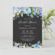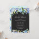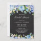 Convide familiares e amigos para o seu evento com este chá de panela floral azul rústico. Apresenta ilustrações em aquarela de hífenes azuis, rosas e peonias, rosas brancas, anêmonas brancas, verde com fundo falso em painéis. A paleta colorida deste convite floral hipnórdico é perfeita para chás de panela de primavera e inverno. Personalize adicionando nomes, data, hora, local e outros detalhes do evento. Altere o padrão floral para uma foto ou qualquer outra imagem.