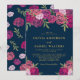 Convide seus convidados para o seu casamento com este elegante convite azul com bonito tons rosa e roxos, buquê floral de rosas de aquarela, folhas verdes e speck de ouro.