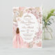 Convite de aniversário num estilo elegante. Rosas brancas e rosa-pinceladas, floral seca, palma e grama-pampas e uma menina de vestido bonito.
