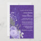 Convite de casamento elegante feito em um visual de damasco roxo, com gráficos de rosas lavanda e penas cintilantes bonitas e acentos de folhas. Personalize o texto personalizado branco para o seu dia especial.