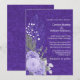 Convite de casamento elegante feito em uma aparência de damasco roxo, com gráficos de rosas lavanda e penas cintilantes e acentos de folhas. Personalize o texto personalizado branco para o seu dia especial.