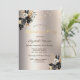 Um convite moderno, chico e glamouroso com uma elegante tiara de ouro, rosas pretas e luzes de cordas sobre um fundo de marfim.