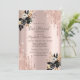 Um convite moderno, chico e glamouroso com pingos de brilho e rosas pretos em fundo rosa de ouro.