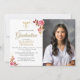 Um delicado arranjo floral de aquarela de rosas cor-de-rosa e dourados com aspersão de ouro macio (isto é um efeito digital, não uma folha de ouro real), assim como um caduceus dourado são as decorações elegantes para este simples, clássico e moderno convite para a graduação na escola de enfermagem com foto, que você pode personalizar e modificar completamente com o nome da escola, o diploma etc. A grande área de modelo permite muito espaço para incluir a localização da cerimônia de graduação e uma celebração depois, ou personalizá-la simplesmente com os detalhes da festa de formatura.