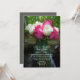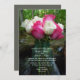 Um convite de casamento com uma foto de um jarro de rosas rosa e brancas sentadas na pequena cascata de um riacho. Personalize o texto.