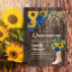 Convite de aniversário de Quinceanera com botas de cowboy rústicas, girassóis amarelos brilhantes e belos rosas azuis sobre um fundo castanho escuro.