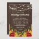 Convite para casamento de celeiros russos com um fundo impresso de grãos de madeira, decorado com arranjos de girassóis e rosas vermelhas profundas, trigo, bagas e folhas verdes, e filas de luzes brilhantes. A celebração do casamento está escrita num lindo roteiro de caligrafia, ligeiramente amarelado.