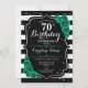 Convite de aniversário 70. Elegante design verde-esmeralda floral com prata brilhante e rosas. Apresenta faixas pretas e brancas e fontes de script. Perfeito para uma comemoração de um dia de mulher na moda. Pode ser personalizado para qualquer idade! Impressos convites Zazzle ou modelo de impressão digital instantânea para download.