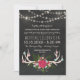 Um convite de casamento rústico para cambotas, com galhos desenhados à mão decorados com flores, como rosas, trevas e hálito de bebê, e verde, como o samambaia e outras folhas. Entre os traficantes florais e linhas de luzes brilhantes de cordas, você pode personalizar o texto do convite de casamento, que está escrito em fontes bonito de ajuste de quadro.