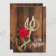 Convidem convidados para comemorar que estão noivos para se casarem e ficarem presos com o encantador Convite à Festa de noivado de Rosas vermelhas e Bits de Cavalo. Esta festa de noivado temática casual, porém clássica, equestre ocidental apresenta uma fotografia floral, ligeiramente melhorada, de flores de rosa vermelha, colar pérolas, pedras e rédeas de couro com um fundo de madeira de caseiro castanho.