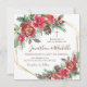 Um belo convite para o casamento cristão, de inverno e de Natal, retrata um design floral natural com uma Cruz Cristã, rosas elegantes, vermelhas e cor-de-rosa, bagas, pinecones, verde-vento e uma estrutura geométrica dourada. As costas mostram a canção Versa Bíblia de Salomão 3:4, "Eu encontrei a canção que minha alma ama."